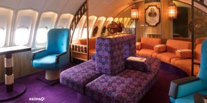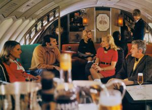 En ese espacio reservado, los pasajeros podían disfrutar de cómodos asientos, un elegante bar y un ambiente cuidadosamente decorado en tonos cálidos como naranja y marrón, representativos del estilo de la época. El ambiente transmitía glamour y sofisticación, convirtiendo cada vuelo en un evento especial.
